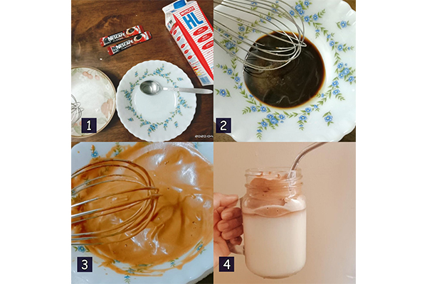 - Fill a glass with milk and top it off with the mixture that you made.