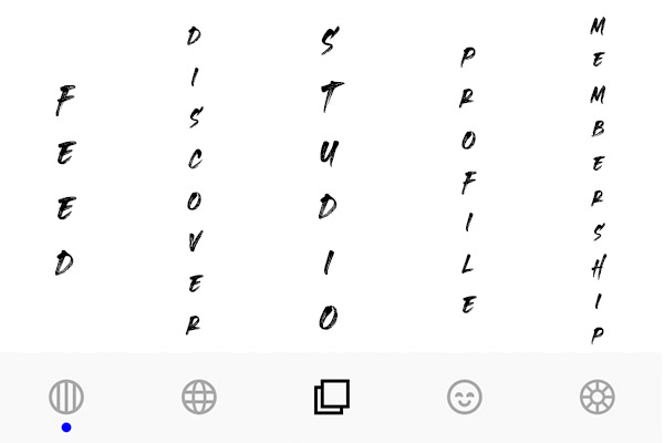 There are a total of five tabs in the VSCO app. Feed, Discover, Studio, Profile, and Membership. (Left to Right)