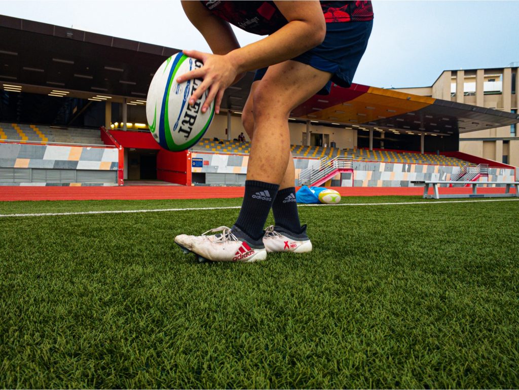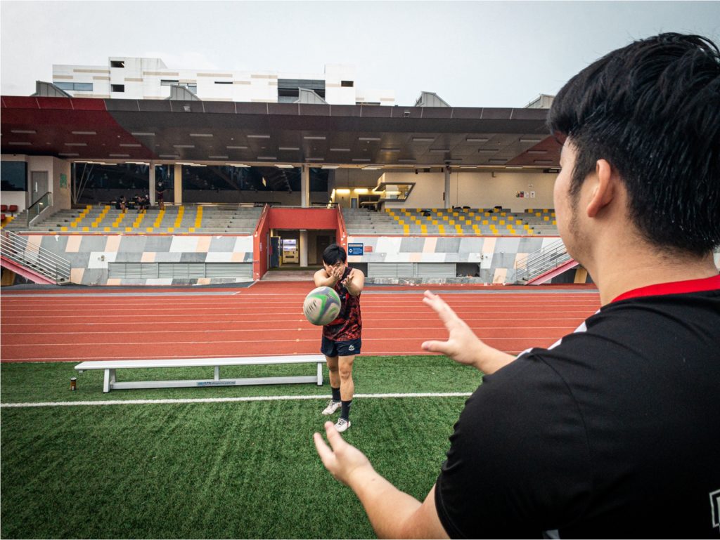 Ezekiel Lee, on the football field, warming up and stretching his muscles for rugby training in Temasek Polytechnic, Singapore, May 25, 2021.