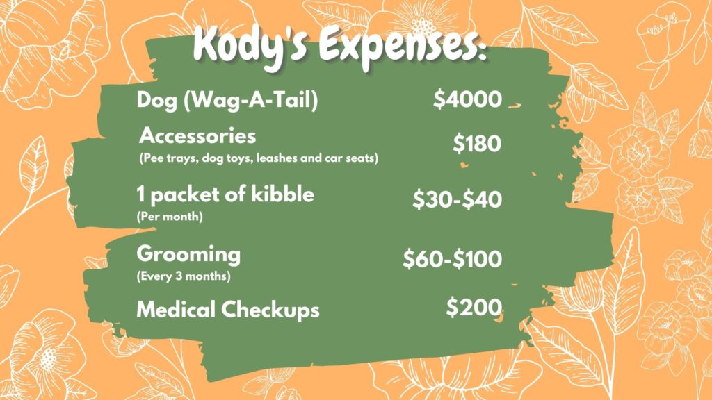 For Joey, who owns a maltese named Kody, the dog itself cost her $4000 from Wag-A-Tail. Upon getting him, accessories like a pee tray, dog toys, leashes and car seats cost her $180. On a monthly basis “For food, 1 packet of kibble costs around $30-$40. For my dog, that’s enough for one month since he’s small. Grooming can cost, on average, $60-$100 every 3 months or so. Medical checkups cost about $200 but can cost more if any additional treatment is needed.” she said.