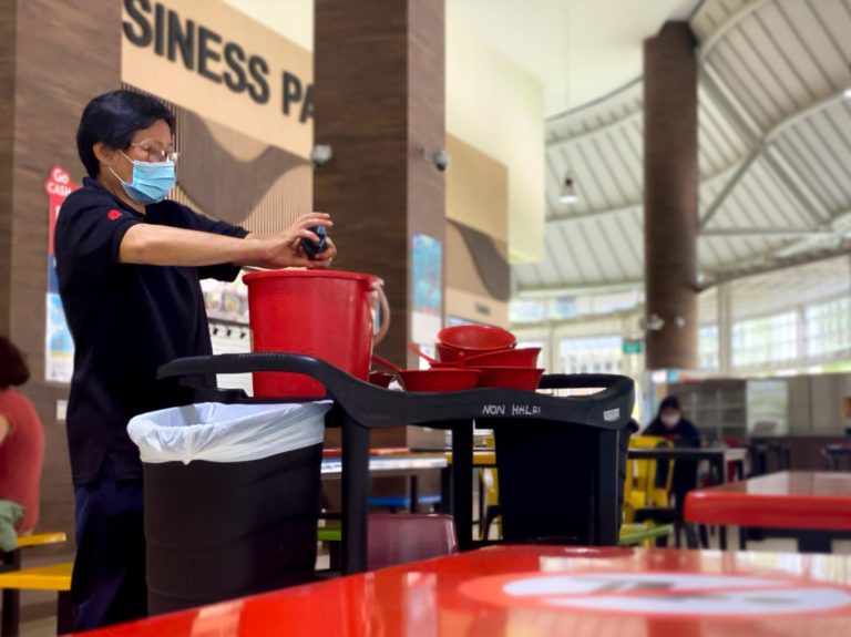 A cleaner prepares to wipe the tables for students and staff who are dining in on-campus at Temasek Polytechnic during the Phase 2 (Heightened Alert), May 20, 2021.