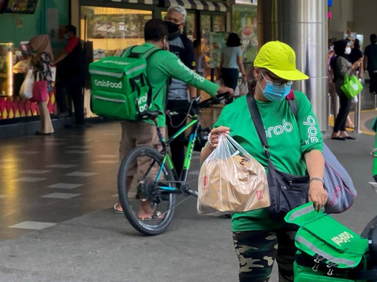 GrabFood delivery rider prepares to deliver a customer’s order from Tampines 1 as the newly imposed dine-in ban increases the demand for food delivery, June 4, 2021.