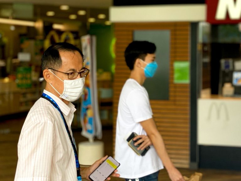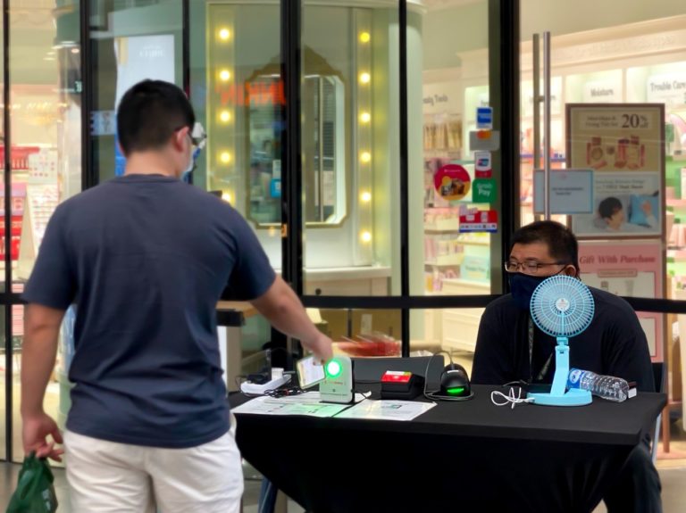 SafeEntry staff checks the temperature and SafeEntry check-ins for all shoppers entering Tampines 1 during the Phase 2 (Heightened Alert) on June 4, 2021.